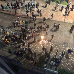 Estando aquí sentados, empezamos a oír de nuevo el ya tan famoso Cacerolazo, y gritos de gente y chiflidos, y en general jaleo… acto seguido, una detonación y gente corriendo (señal de que estaban ya tirando gas lacrimógeno).